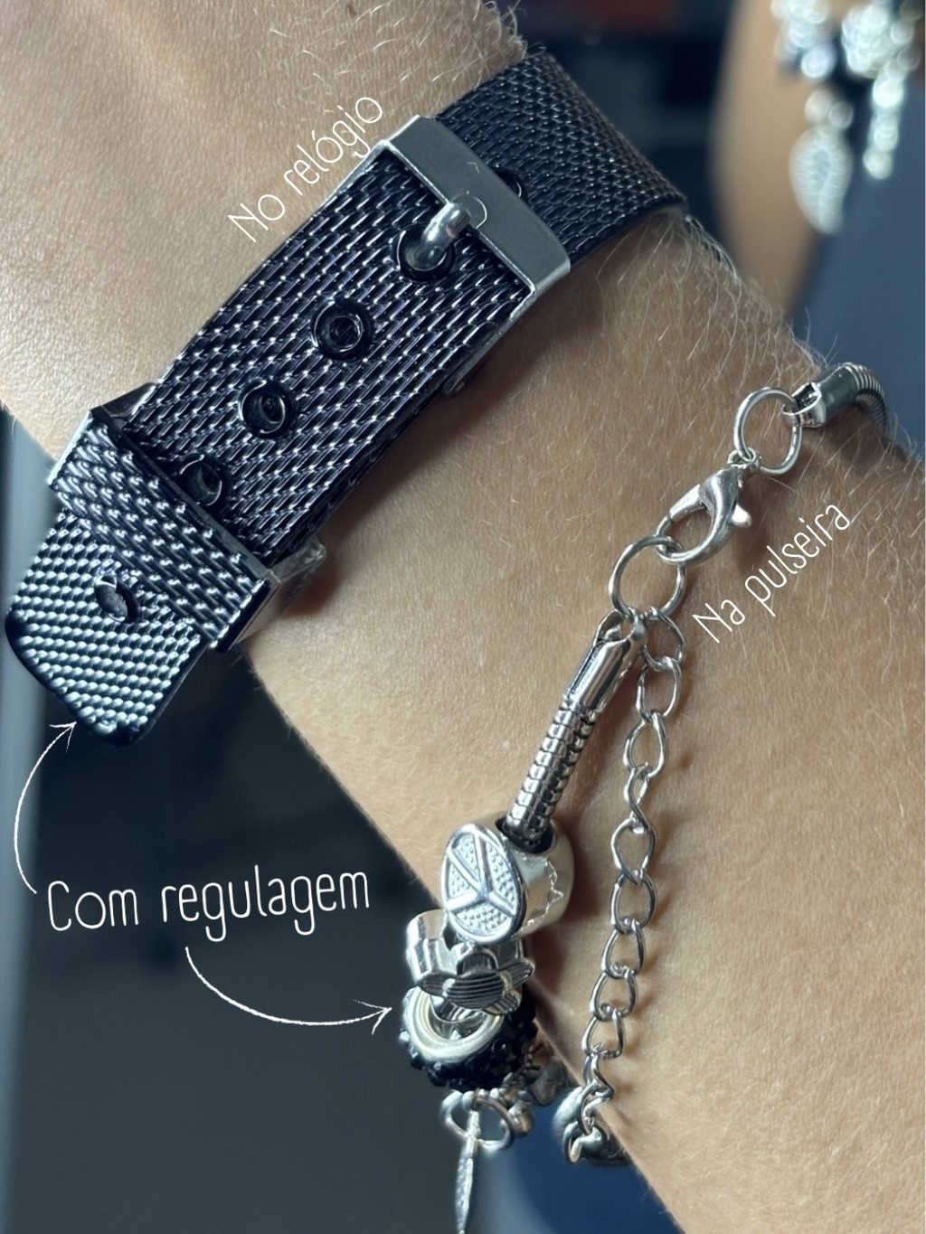Design Moderno: O kit inclui um relógio elegante e uma pulseira de silicone, que se destaca pelo seu conforto e durabilidade. A pulseira biju com regulagem permite que você ajuste conforme sua preferência, proporcionando um encaixe perfeito no pulso.